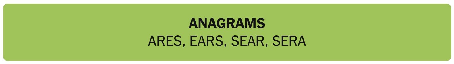 - ANAGRAMS – ARES, EARS, SEAR, SERA