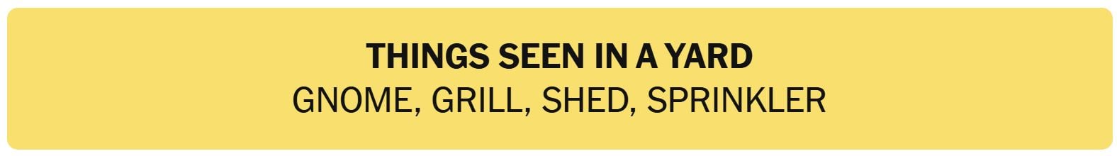 - THINGS SEEN IN A YARD – GNOME, GRILL, SHED, SPRINKLER