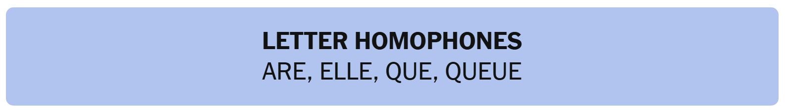 - LETTER HOMOPHONES – ARE, ELLE, QUE, QUEUE