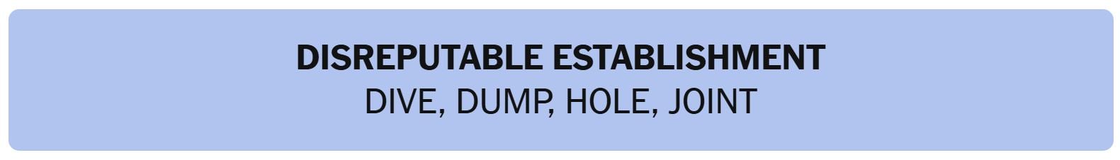 - DISREPUTABLE ESTABLISHMENT – DIVE, DUMP, HOLE, JOINT