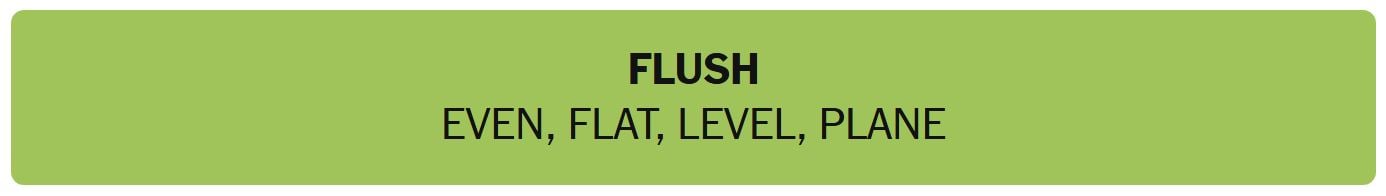 - FLUSH – EVEN, FLAT, LEVEL, PLANE