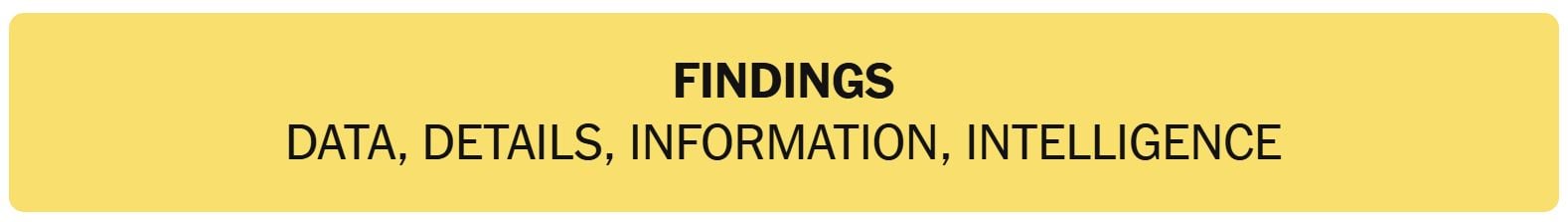 - FINDINGS – DATA, DETAILS, INFORMATION, INTELLIGENCE