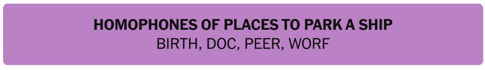 - HOMOPHONES OF PLACES TO PARK A SHIP – BIRTH, DOC, PEER, WORF