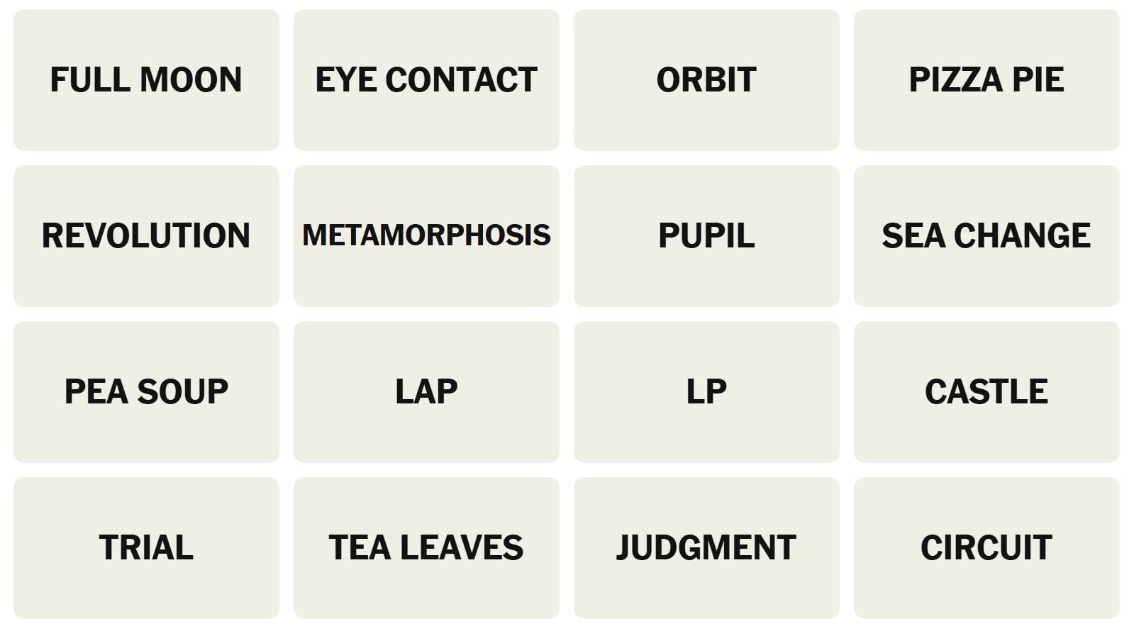 There are sixteen words for the Connection puzzles, which are: