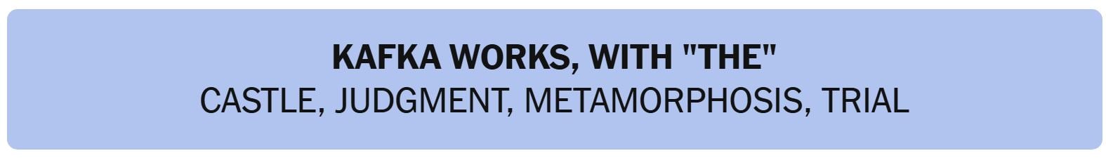 - KAFKA WORKS, WITH “THE” – CASTLE, JUDGMENT, METAMORPHOSIS, TRIAL