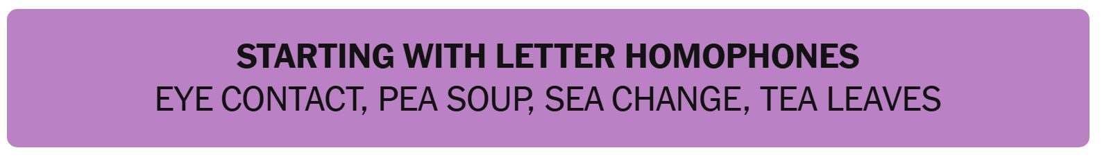 - STARTING WITH LETTER HOMOPHONES – EYE CONTACT, PEA SOUP, SEA CHANGE, TEA LEAVES
