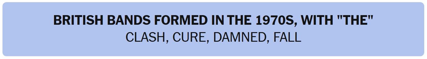 • BRITISH BANDS FORMED IN THE 1970S, WITH “THE” – CLASH, CURE, DAMNED, FALL
