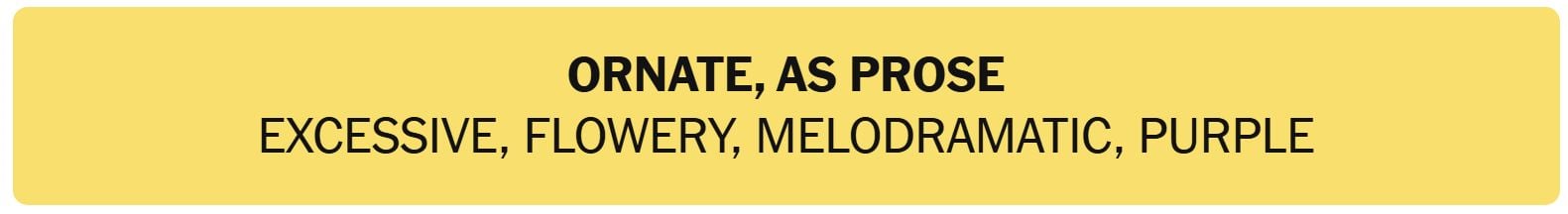- ORNATE, AS PROSE – EXCESSIVE, FLOWERY, MELODRAMATIC, PURPLE