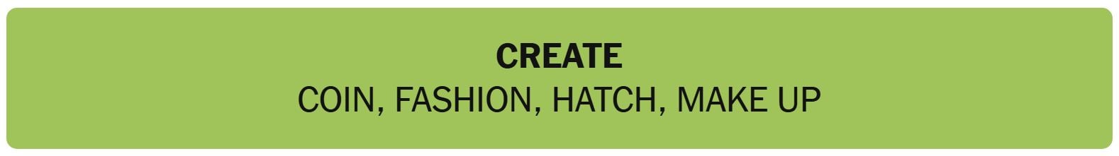 - CREATE – COIN, FASHION, HATCH, MAKE UP