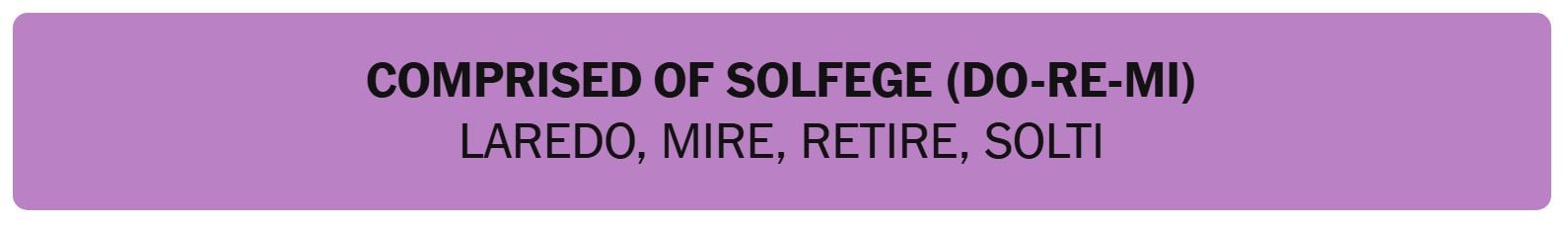 - COMPRISED OF SOLFEGE (DO-RE-MI) – LAREDO, MIRE, RETIRE, SOLTI