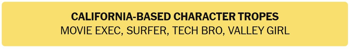 - CALIFORNIA-BASED CHARACTER TROPES – MOVIE EXEC, SURFER, TECH BRO, VALLEY GIRL