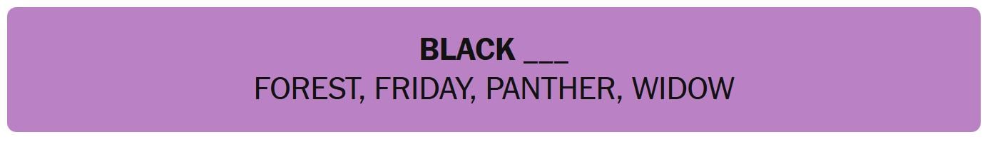 - BLACK ___ – FOREST, FRIDAY, PANTHER, WIDOW
