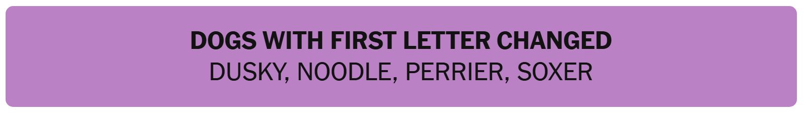 - DOGS WITH FIRST LETTER CHANGED – DUSKY, NOODLE, PERRIER, SOXER