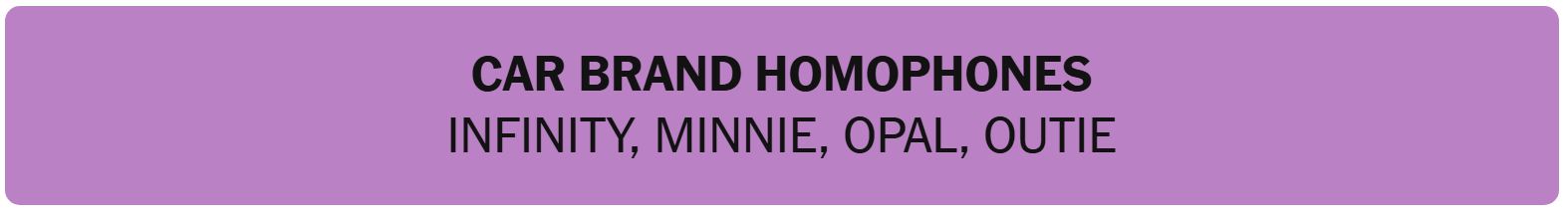 - CAR BRAND HOMOPHONES – INFINITY, MINNIE, OPAL, OUTIE