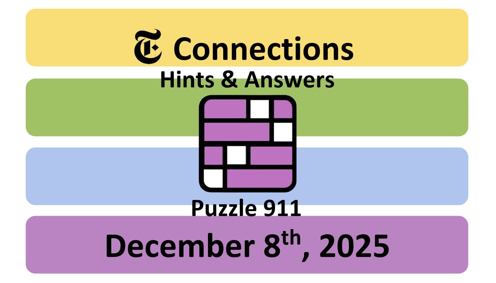 Here are the answers for the NYT Connections puzzle #911 today, released on December 8th, 2025, and some hints to help you solve them.
