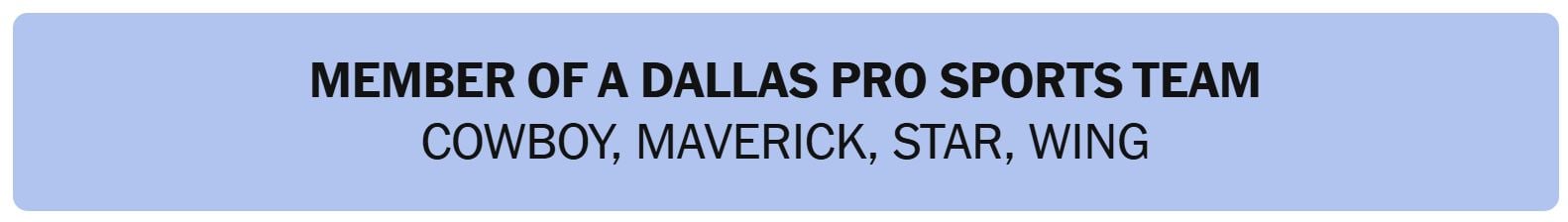 - MEMBER OF A DALLAS PRO SPORTS TEAM – COWBOY, MAVERICK, STAR, WING