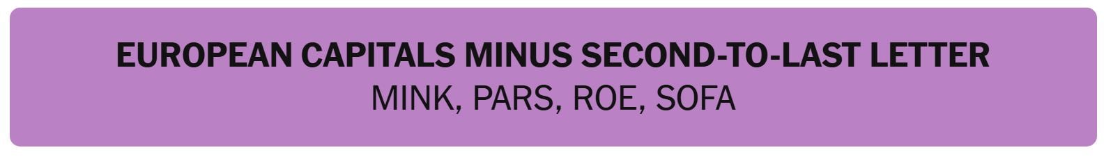 - EUROPEAN CAPITAL MINUS SECOND-TO-LAST-LETTER – MINK, PARS, ROE, SOFA