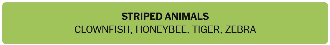 - STRIPED ANIMALS – CLOWNFISH, HONEYBEE, TIGER, ZEBRA