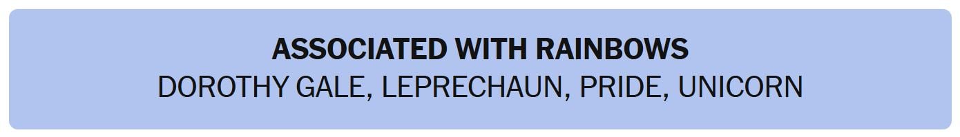 - ASSOCIATED WITH RAINBOWS – DOROTHY GALE, LEPRECHAUN, PRIDE, UNICORN