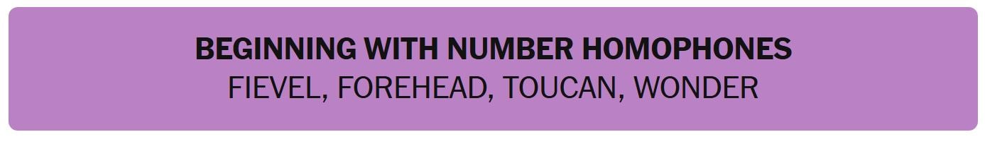 - BEGINNING WITH NUMBER HOMOPHONES – FIEVEL, FOREHEAD, TOUCAN, WONDER