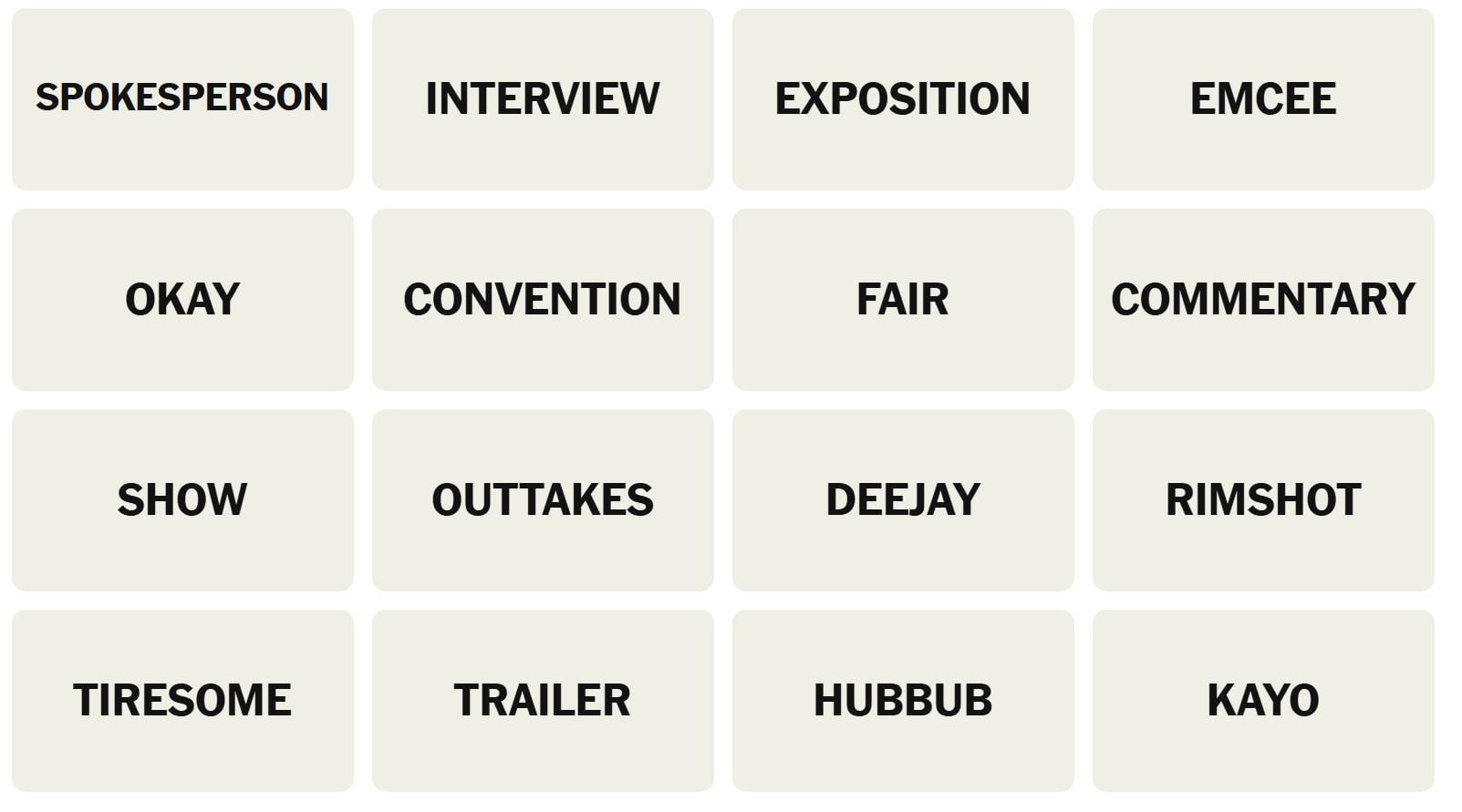There are sixteen words for the Connection puzzles, which are: