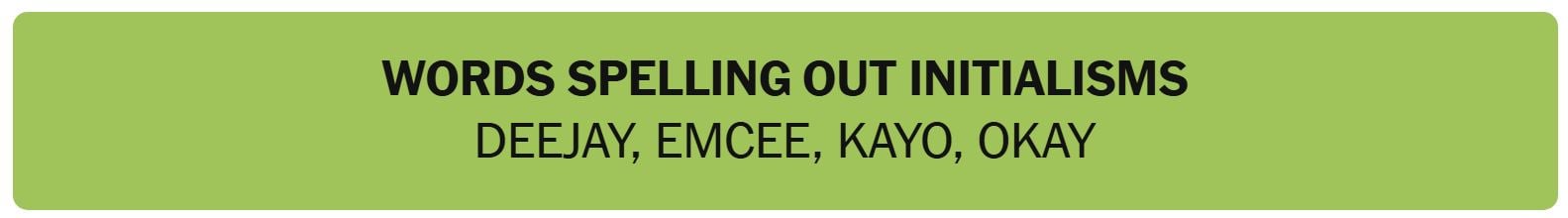 - WORDS SPELLING OUT INITIALISMS – DEEJAY, EMCEE, KAYO, OKAY