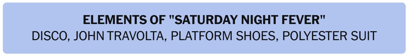 - ELEMENTS OF “SATURDAY NIGHT FEVER” – DISCO, JOHN TRAVOLTA, PLATFORM SHOES, POLYESTER SUIT