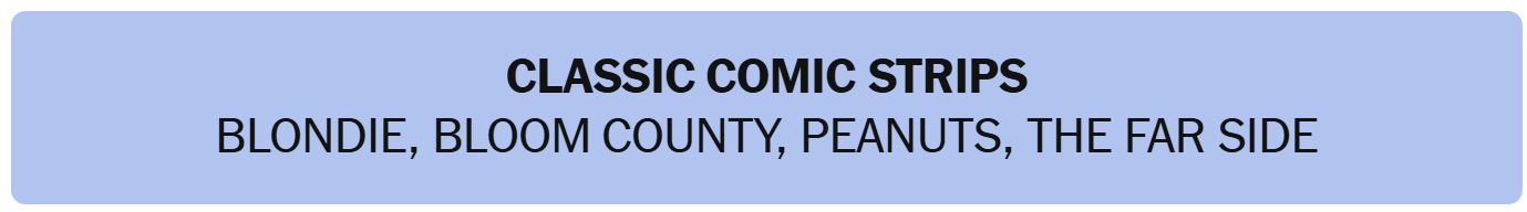 - CLASSIC COMIC STRIPS – BLONDIE, BLOOM COUNTY, PEANUTS, THE FAR SIDE