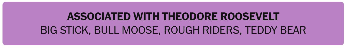 - ASSOCIATED WITH THEODORE ROOSEVELT – BIG STICK, BULL MOOSE, ROUGH RIDERS, TEDDY BEAR