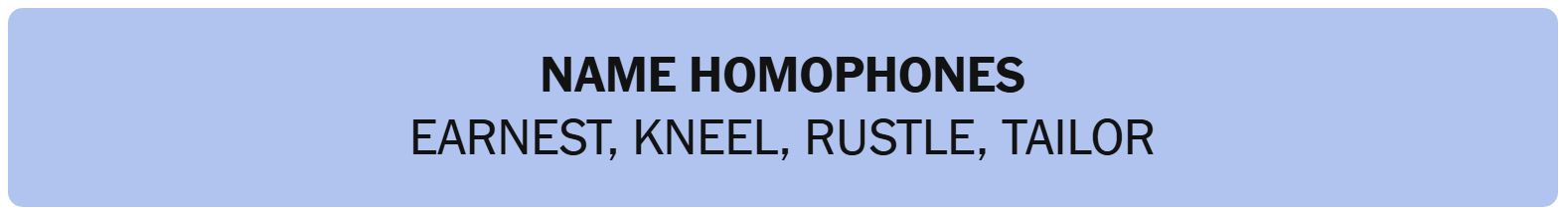 • NAME HOMOPHONES – EARNEST, KNEEL, RUSTLE, TAILOR