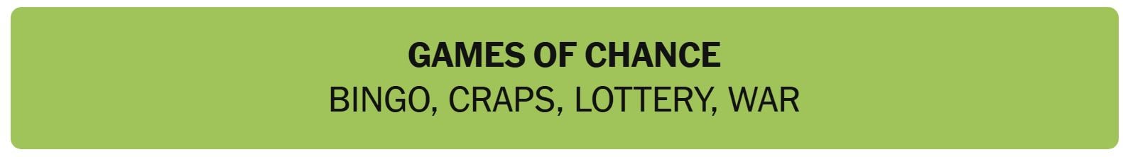 • GAMES OF CHANCE – BINGO, CRAPS, LOTTERY, WAR