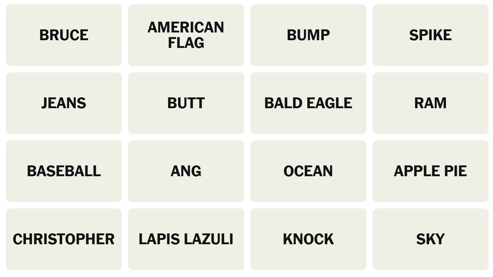 There are sixteen words for the Connection puzzles, which are: