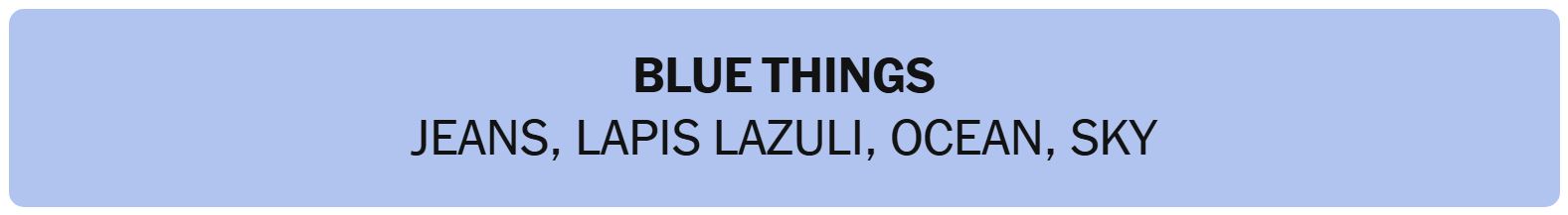 - BLUE THINGS – JEANS, LAPIS LAZULI, OCEAN, SKY