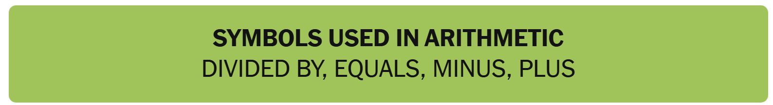 - SYMBOLS USED IN ARITHMETIC – DIVIDED BY, EQUALS, MINUS, PLUS