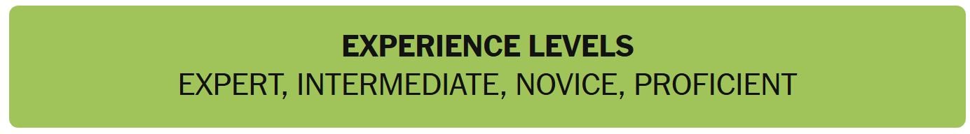 - EXPERIENCE LEVELS – EXPERT, INTERMEDIATE, NOVICE, PROFICIENT