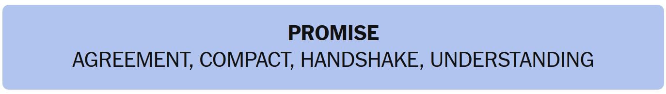 - PROMISE – AGREEMENT, COMPACT, HANDSHAKE, UNDERSTANDING
