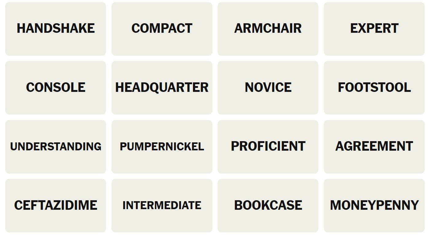 There are sixteen words for the Connection puzzles, which are: