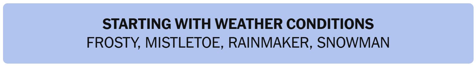 - STARTING WITH WEATHER CONDITIONS – FROSTY, MISTLETOE, RAINMAKER, SNOWMAN