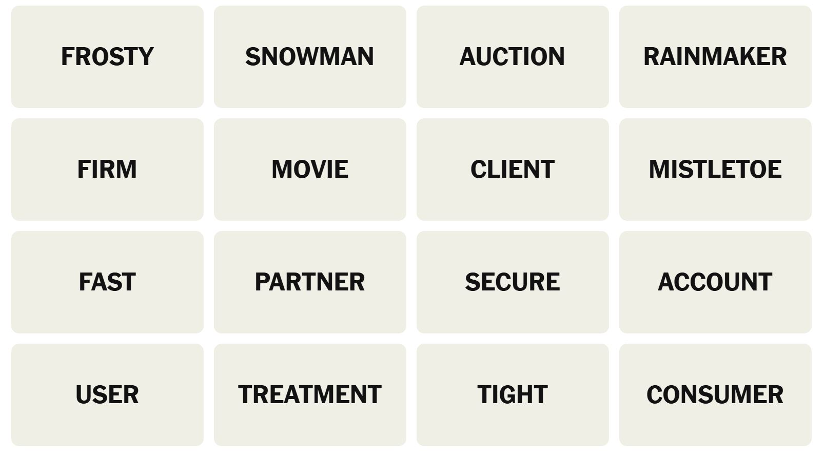 - Hint 2: FROSTY and MISTLETOE are in the same group.