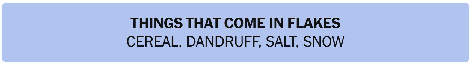 - THINGS THAT COME IN FLAKES – CEREAL, DANDRUFF, SALT, SNOW