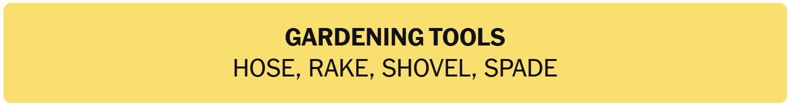 - GARDENING TOOLS – HOSE, RAKE, SHOVEL, SPADE