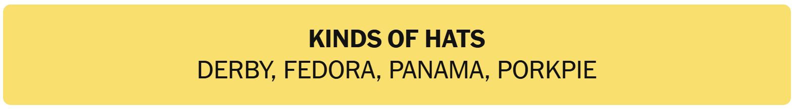 - KINDS OF HATS – DERBY, FEDORA, PANAMA, PORKPIE