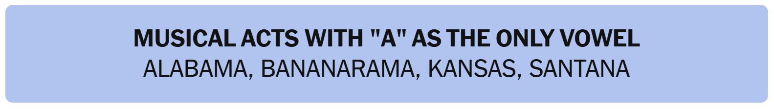 - MUSICAL ACTS WITH “A” AS THE ONLY VOWEL – ALABAMA, BANANARAMA, KANSAS, SANTANA