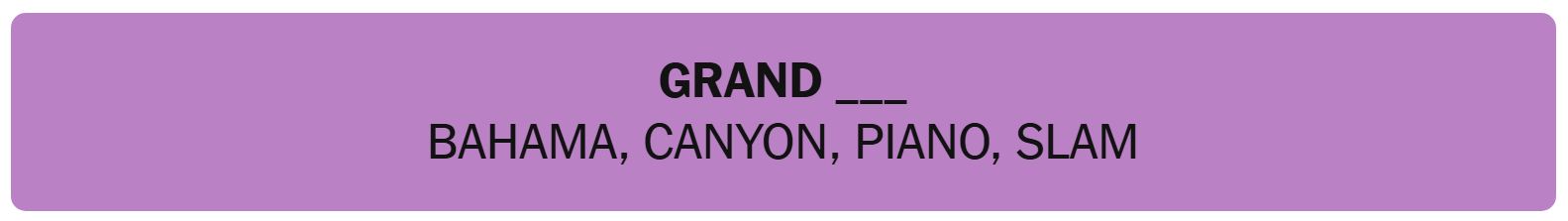 - GRAND ___ – BAHAMA, CANYON, PIANO, SLAM