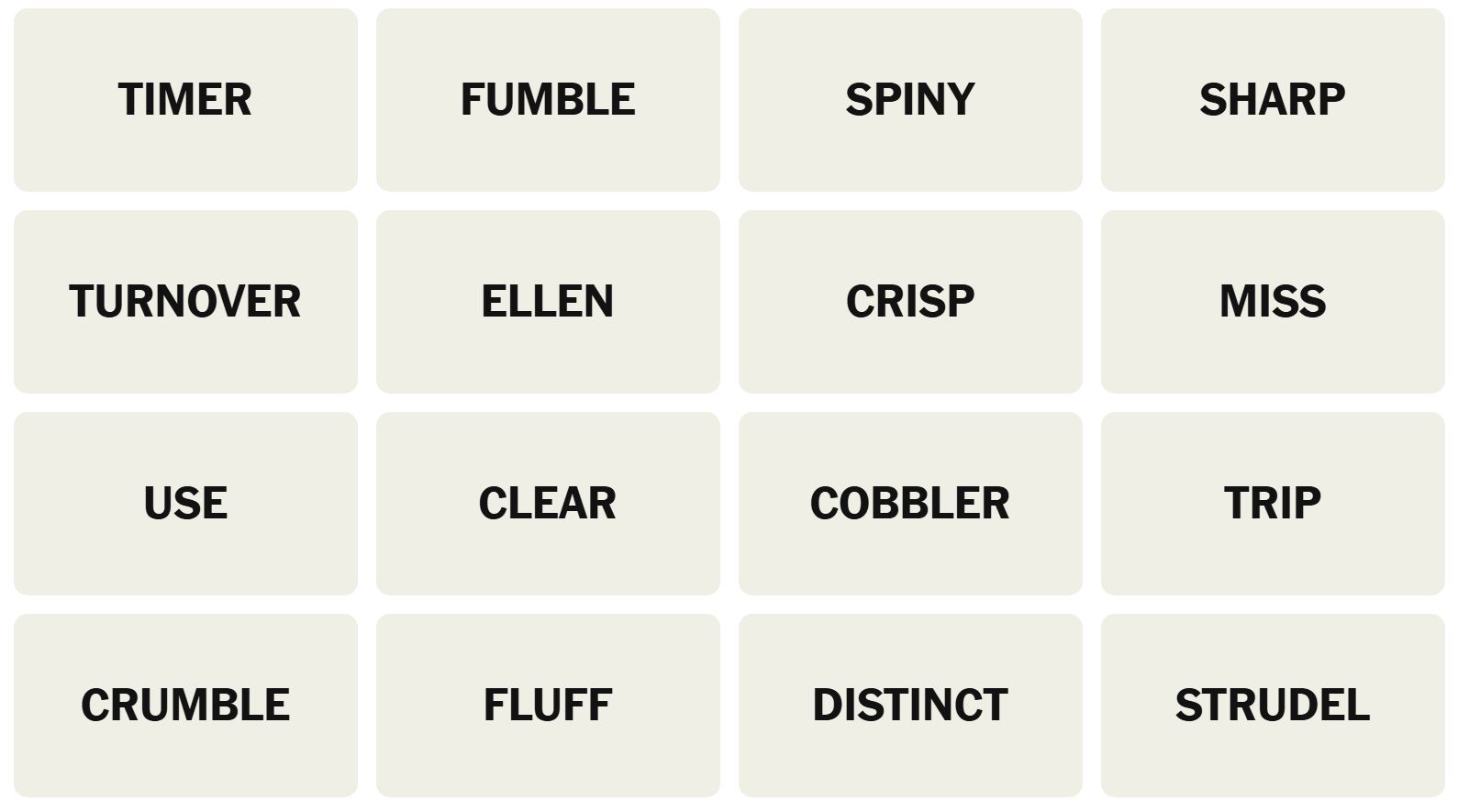There are sixteen words for the Connection puzzles, which are:
