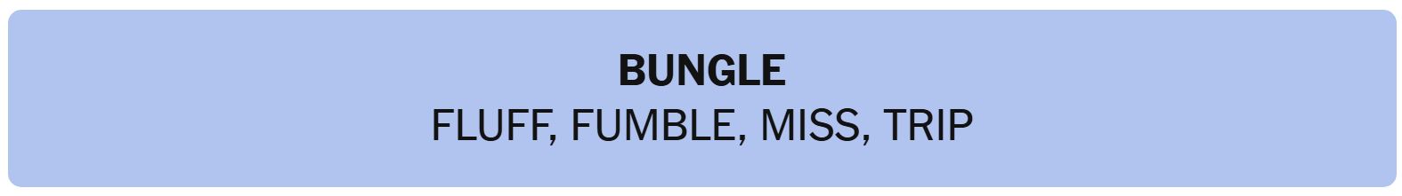 - BUNGLE – FLUFF, FUMBLE, MISS, TRIP