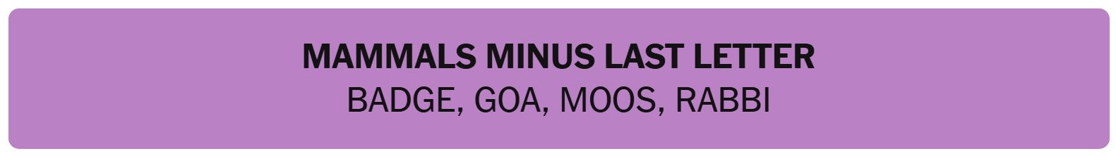 • MAMMALS MINUS LAST LETTER – BADGE, GOAT, MOOS, RABBI