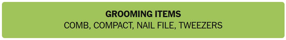 - GROOMING ITEMS – COMB, COMPACT, NAIL FILE, TWEEZERS