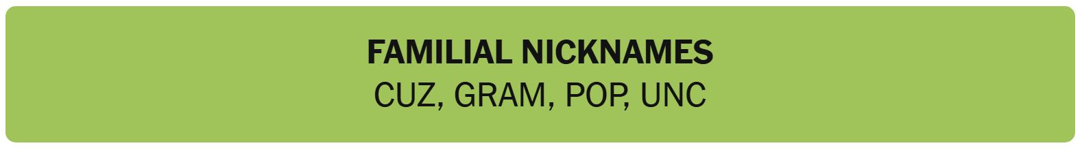 • FAMILIAL NICKNAMES – CUZ, GRAM, POP, UNC
