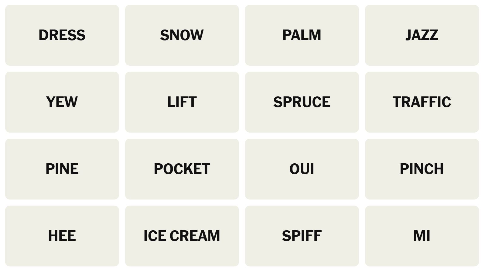 - Hint 2: DRESS and SPRUCE are in the same group.